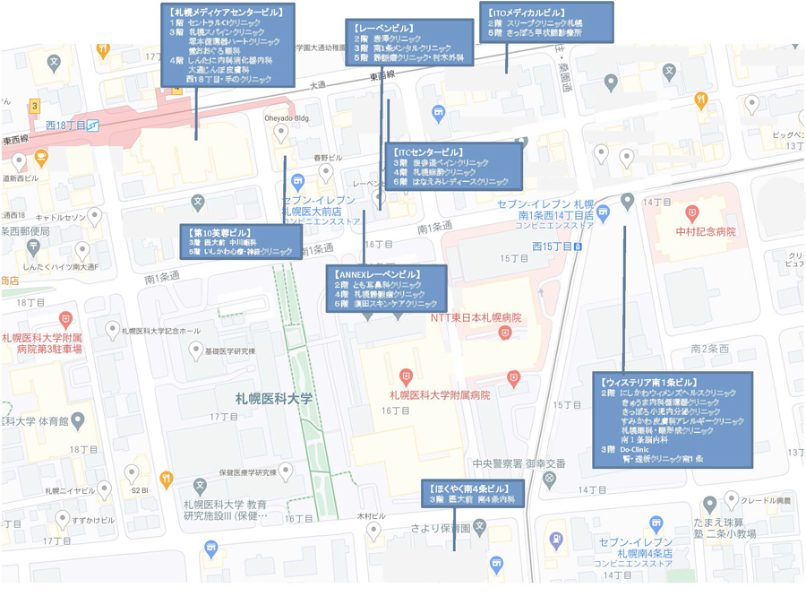 赤いマーカー:岩澤クリニック(1-245レーベンビル2F:札幌市中央区南1条西16丁目)