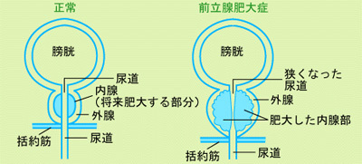 前立腺肥大症は男性の国民病とまでいわれ、最近多くなっている疾患です。「トイレが近い」、「残尿感」、「間に合わず尿をもらす」、「尿が途切れる」、「尿の勢いが弱い」などの症状を中高年の方でしたら、一度は経験しているでしょう。前立腺肥大症は直腸診、超音波検査などで診断されます。そして、その治療方法は自覚症状の程度や前立腺の大きさ、残尿量によりいろいろとあります。各治療法には長所、短所がありますので、医師と十分相談して選択することが大切です。