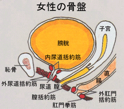 その過程でさまざまな障害(蓄尿障害)が起こることによって、それがうまくできないということになります。蓄尿障害の一つは、膀胱炎です。膀胱に炎症があると、その刺激で頻尿や痛みのほかに尿失禁が生じます。二つめは、膀胱の筋肉が排尿とは関係なく勝手な収縮をする場合です。原因は、排尿を支配している脳の中枢が脳卒中などで障害されていたり、事故で脊髄(せきずい)損傷があったりする場合です。三つめは、尿を膀胱にためているときに、十分にコックが閉まらないことに原因がある場合です。この中に、女性の尿失禁で最も多い腹圧性尿失禁がふくまれます。膀胱炎は、主に大腸菌によって引き起こされます。右図は女性の骨盤内部を簡単に示したものですが、腸に住む大腸菌が膣や膀胱に移行しやすいことが理解していただけると思います。排尿を長時間我慢したり、清潔にしていなかったりすることや、過労や性交渉などが誘因となって膀胱炎になります。炎症が起きると、その刺激で尿が近くなり、痛みがあり、尿も濁ります。残尿感もあり、血液が混じることも尿がもれることもあります。以上のような感染症ではなくて尿が漏れるという場合に、女性の30~45パーセントにみられる腹圧性尿失禁が最も問題になります。図でもわかりますが、膀胱や子宮は骨盤の底にある骨盤底筋群(括約筋も含まれる)で支えられています。これら全体の筋肉が年を取るにつれて衰えてくると、お腹に急に力が加わったときに尿がもれるようになります。せきやくしゃみ、運動などで尿がもれるというのは骨盤の底を支える骨盤底筋群の筋力が低下した結果、括約筋が緩んだり、膀胱の出口の位置がずれるためです。加齢、更年期、分娩、肥満、便秘などが原因と考えられます。